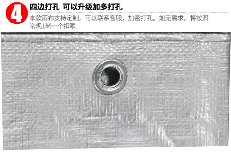 雙銀色PE防水篷布四邊打孔,可以升級加多打孔,本款雨布支持定制,可以加密打孔,如無特殊要求,將按照常規1米一個扣眼。