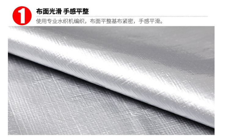 雙銀色PE防水篷布布面光滑,手感平整:使用專業水織機編織,布面平整基布緊密,手感平滑。