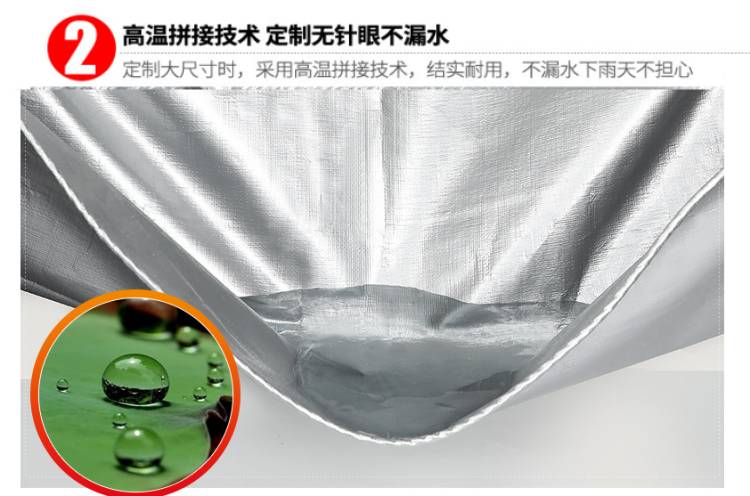 雙銀色PE防水篷布高溫拼接技術,定制無針眼不漏水,定制大尺寸時,采用高溫拼接技術,結實耐用,不漏水下雨天不擔心。